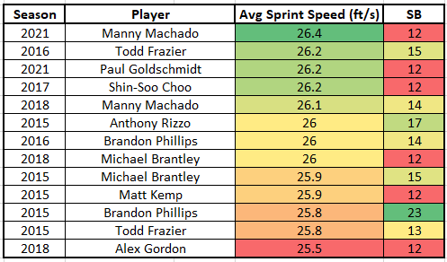 It is only a difference of 0.9 ft./s that separates 2021 Manny Machado from 2018 Alex Gordon, the slowest player from 2015 to 2021 to steal at least 12 bases in a single season. It was Gordon’s 3rd to last season in the majors and the last time he had double digit stolen bases in his career. In Gordon’s defense, he was 34 that year. That said, it makes it more impressive that Brandon Phillips, 3rd and 7th on this list, stole more bases and had faster sprint speeds in his age 34 and 35 seasons, respectively, than Gordon. The 2015 season was Matt Kemp‘s only season with the Padres and his final season where he had more than 1 stolen base.